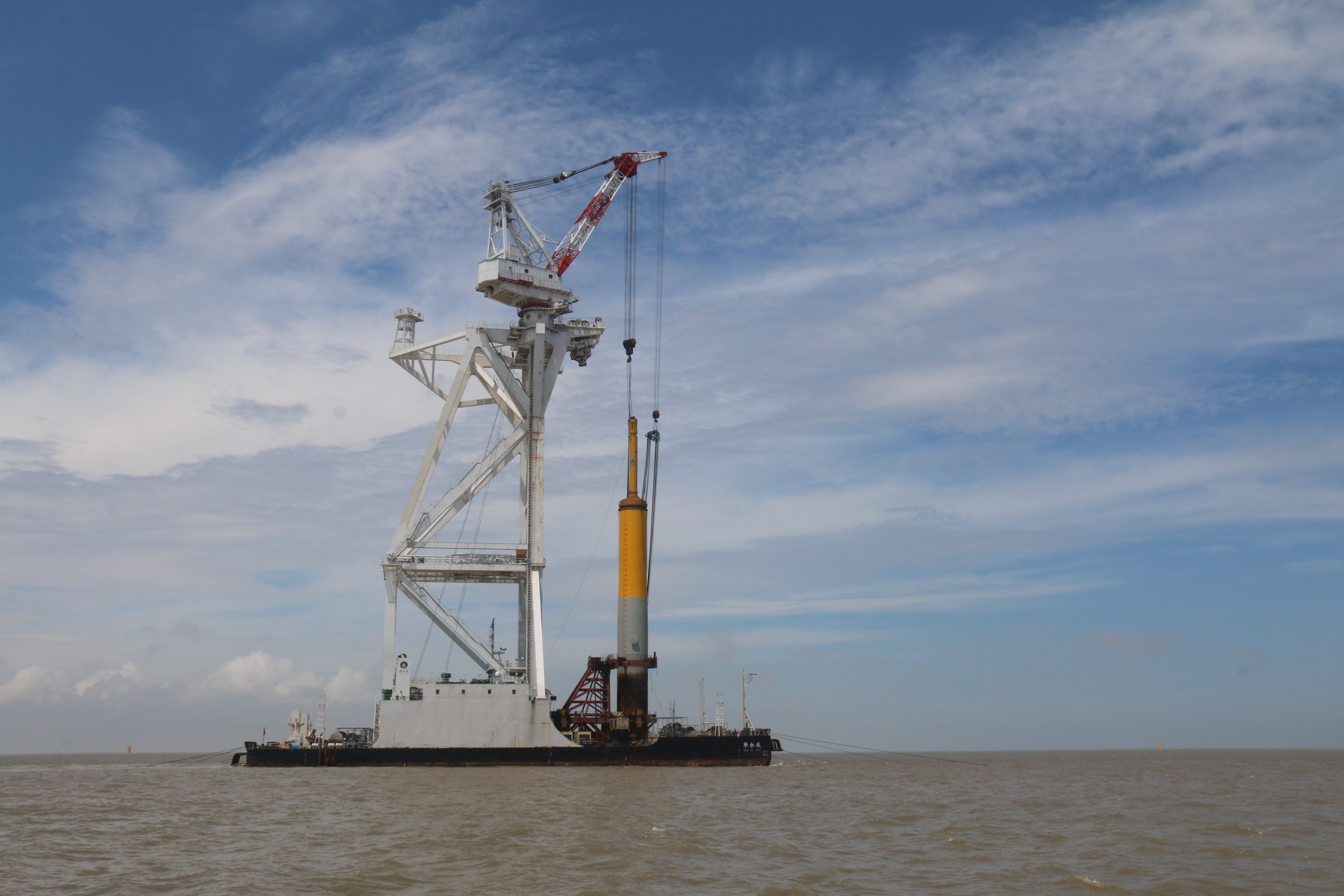 該船船長(zhǎng)90米、寬50米,型深6.8米,最大起重量為1200噸,并配備起升高度為水面以上120米的400噸全回轉(zhuǎn)吊機(jī),能夠完成重量1200噸、高度120米的1.5MW-6MW風(fēng)機(jī)機(jī)型基礎(chǔ)施工和吊裝。